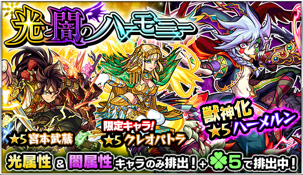 モンスト 4月5日 火 12 00よりガチャ 光と闇のハーモニー 開催 アーサー クレオパトラ ハーメルン など光属性と闇属性のみ排出 Boom App Games